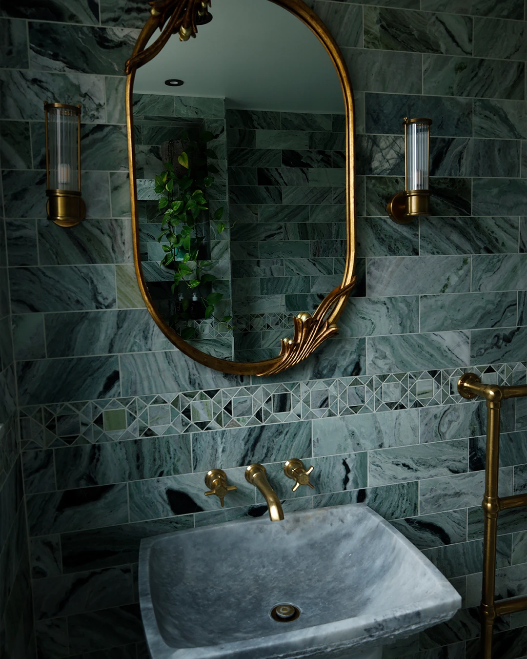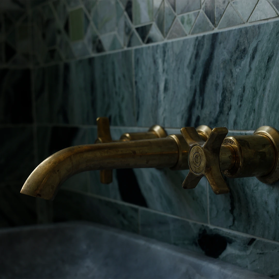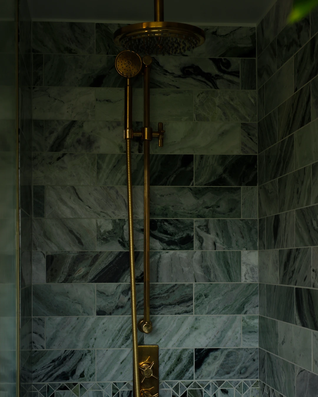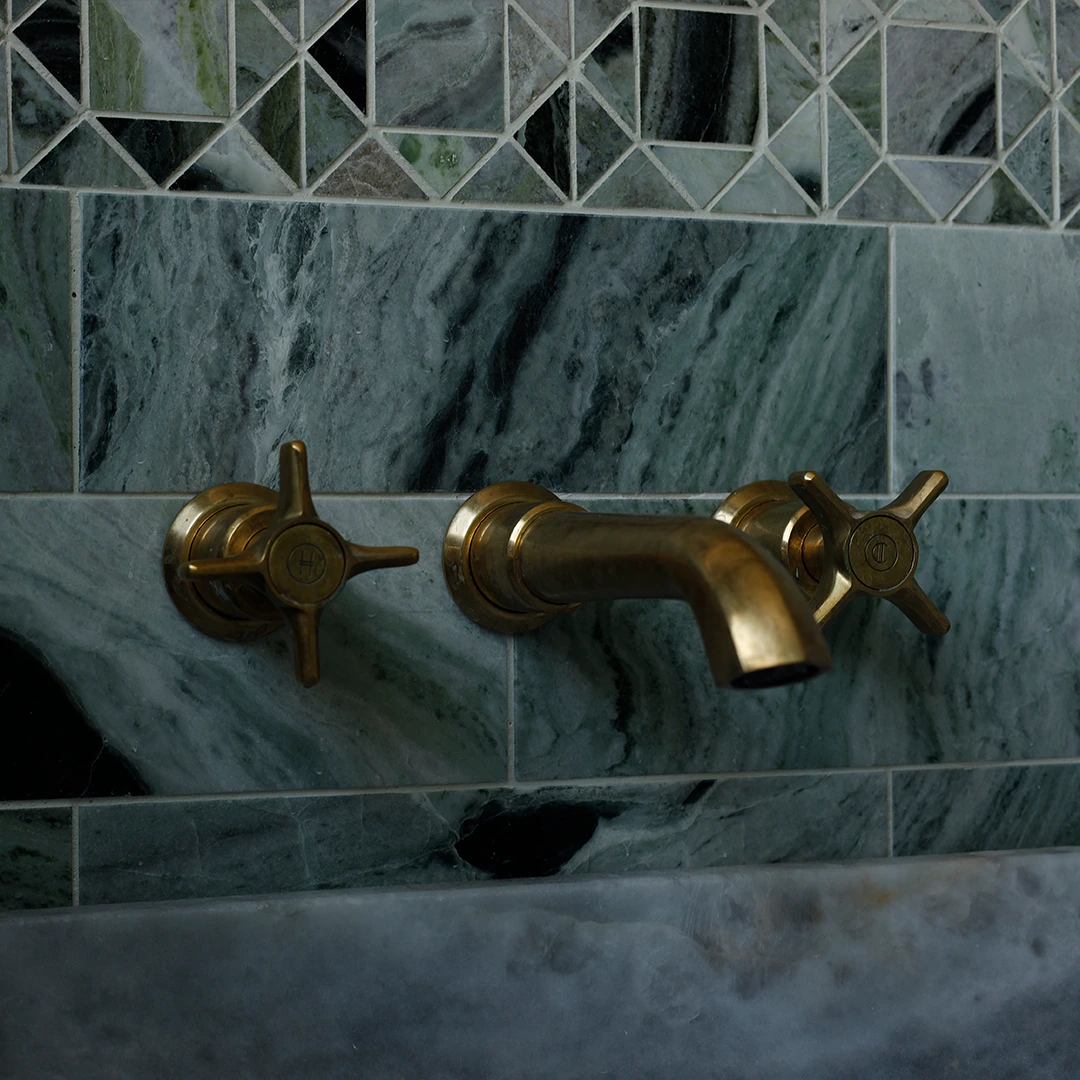 This refined and sophisticated bathroom was inspired by ancient Roman baths, blending green marble with living brass to create a calming yet elegant energy. We repurposed a very small space to improve functionality and deliver a bathroom that is both well-designed and inviting.