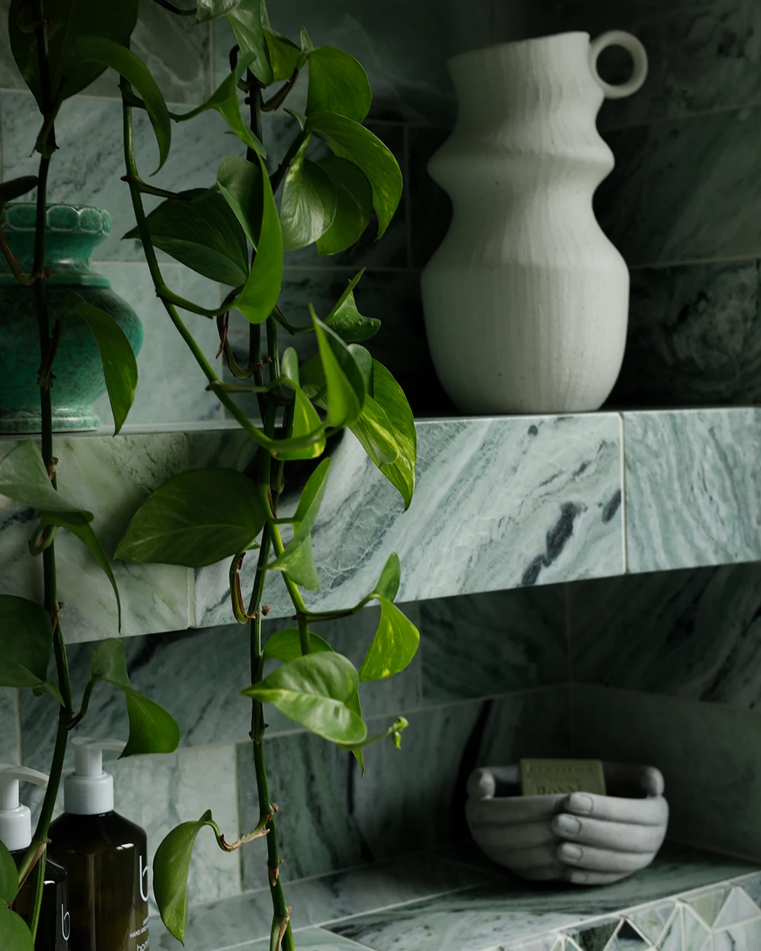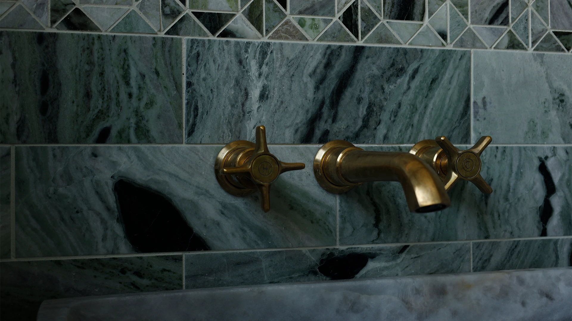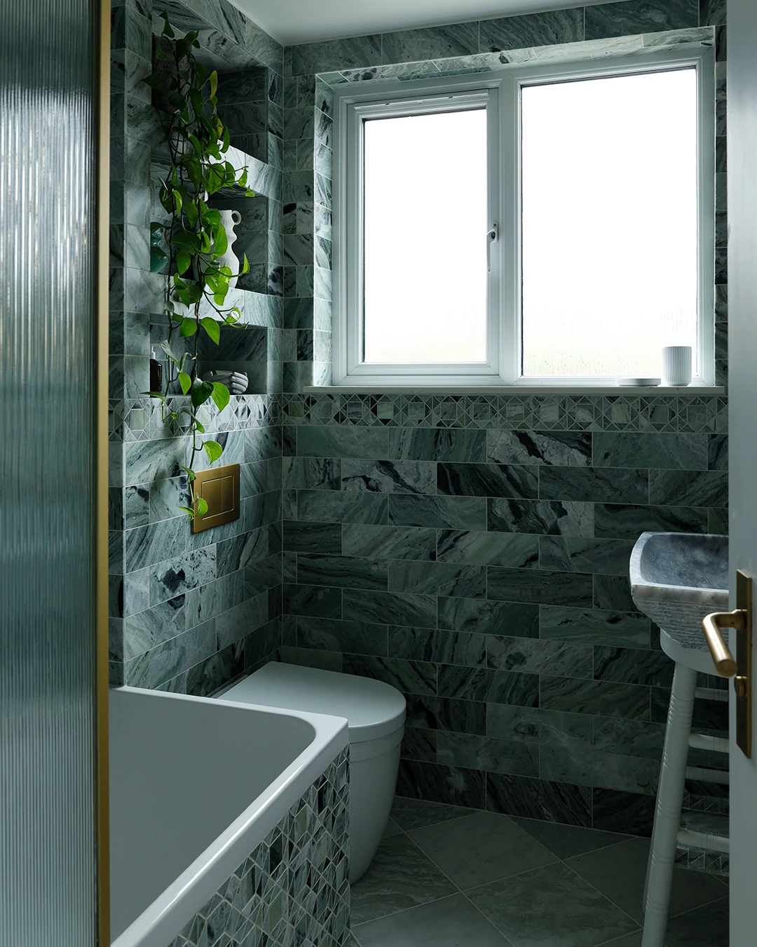 This refined and sophisticated bathroom was inspired by ancient Roman baths, blending green marble with living brass to create a calming yet elegant energy. We repurposed a very small space to improve functionality and deliver a bathroom that is both well-designed and inviting.