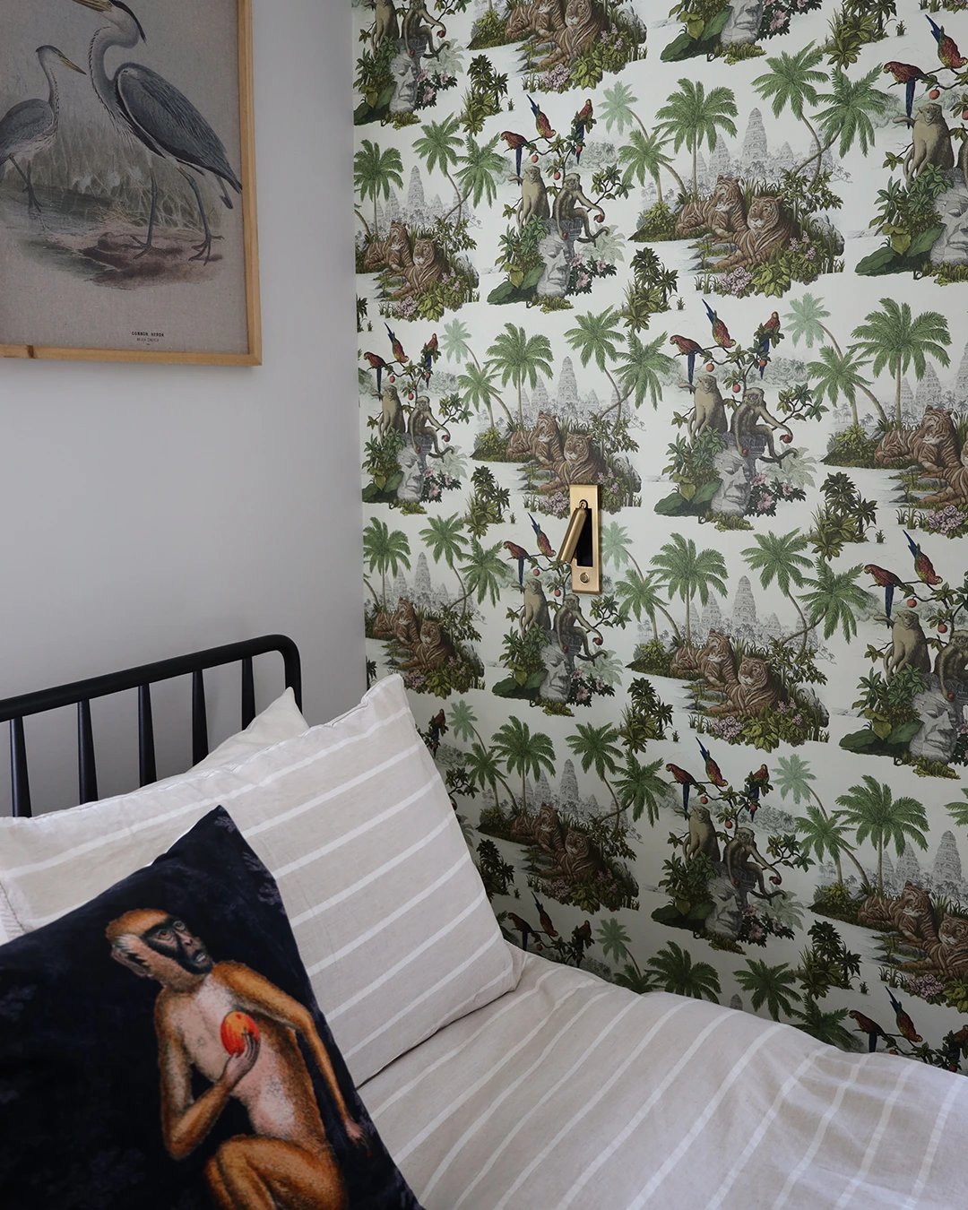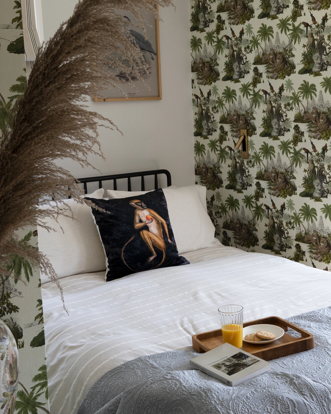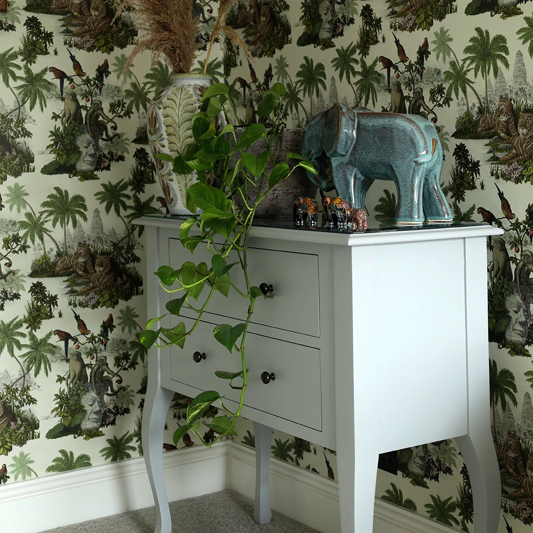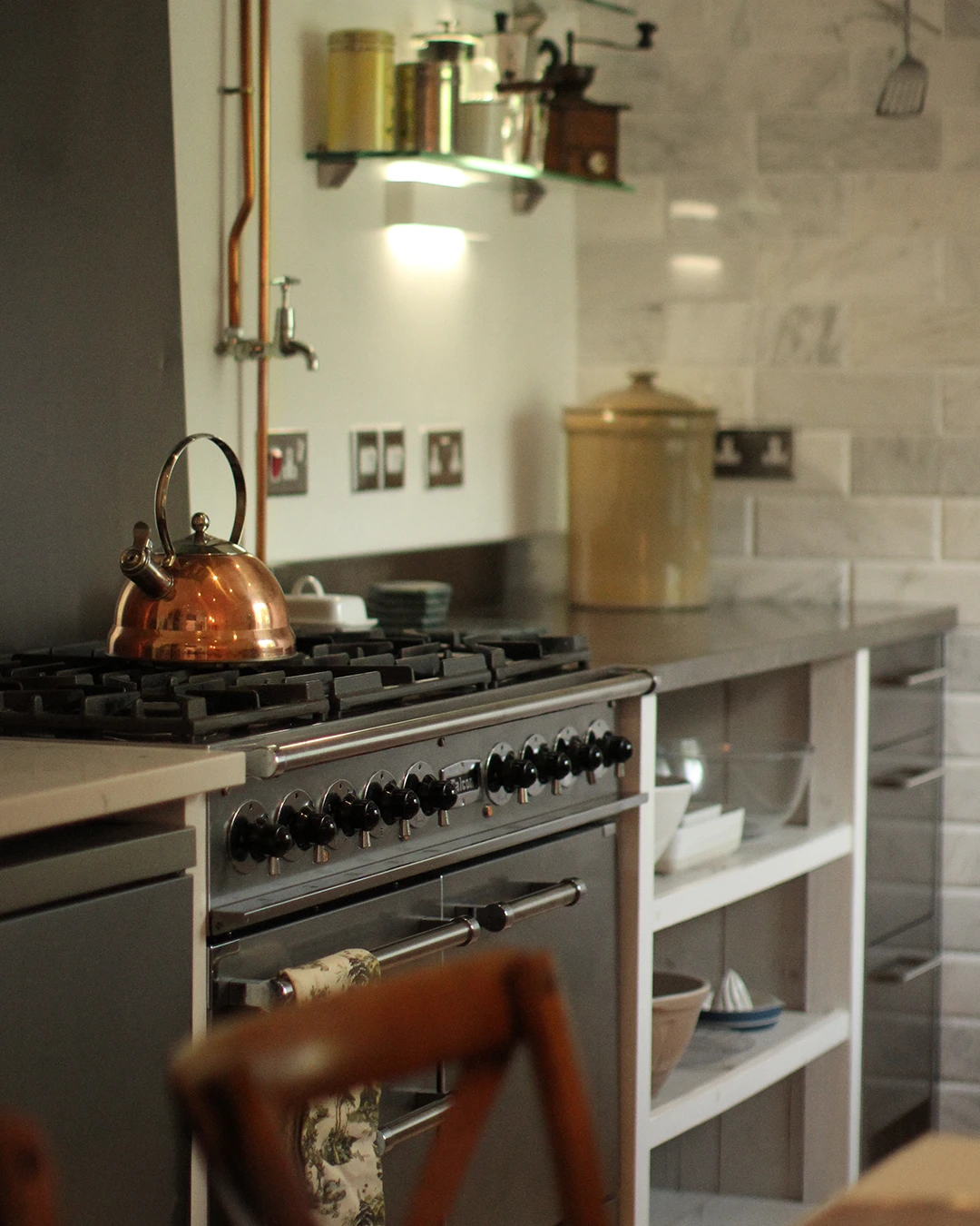 A master bedroom and kitchen project in Bengeo. A bold wallcovering paired with muted panelling creates a master bedroom that balances maximalist style with a calming, serene atmosphere. A family of passionate cooks sought a kitchen that was both highly functional and full of character — a space with personality yet built to last. Stainless steel provides durability for a busy kitchen, while subtle vintage touches, including hints of copper and marble, add warmth and timeless style.